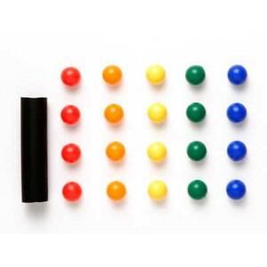 ミニ四駆のセッティングに欠かせないスタビライザーポール。そのボール部分をパーツ化しました。青・緑・黄・橙・赤の5色4個のボールとねじ込み用ゴムチューブをセット。