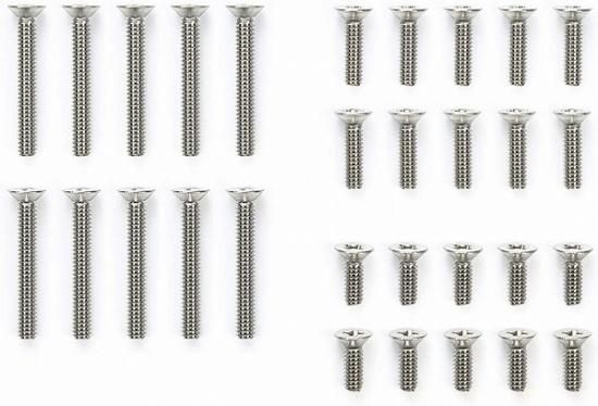ビスの頭が平らな皿ビスのセットです。15518「FRPリヤブレーキステーセット」などシャーシ裏面に取り付けるFRP製プレートに皿穴加工をすれば、ビスの頭が飛び出ることがなくスムーズな底面に仕上げられます。