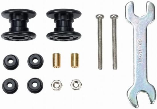低摩擦樹脂製の一体型2段ローラー2個に加えて、取り付け用のビスやナット、スペーサー、板レンチなどもセット
